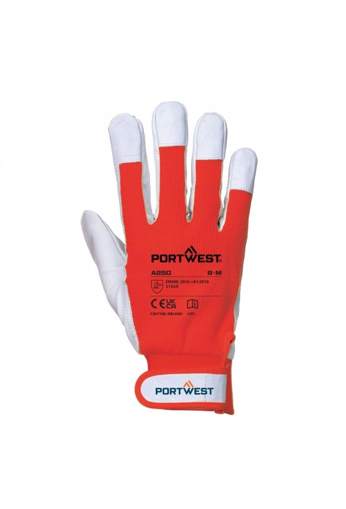 Durable goat grain leather glove with hook & loop fastening, cotton back and reinforced fingertips. Suitable for light industrial applications.