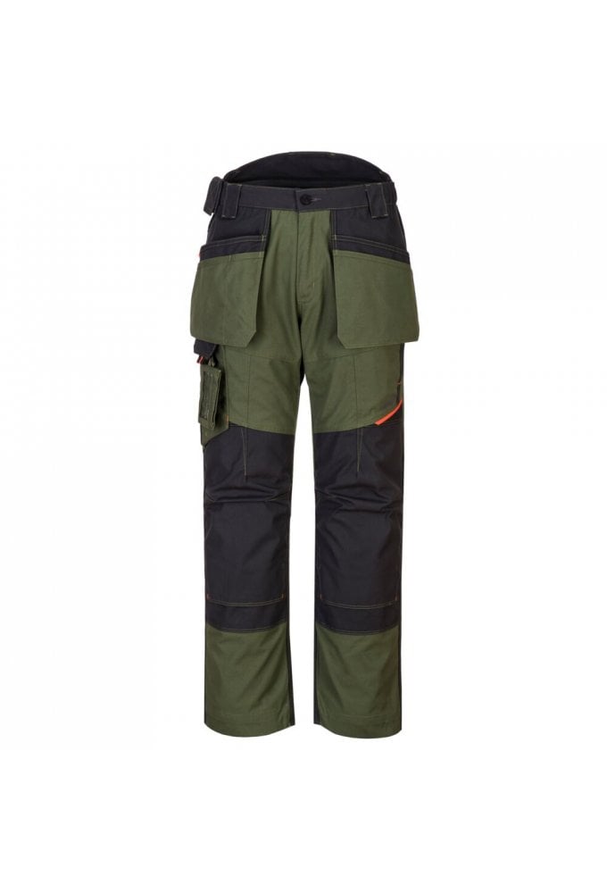 Contemporary work trouser featuring clever holster pockets for ample storage and security. Made from durable poly-cotton canvas fabric and includes triple stitched seams, these trousers have a multitude of practical features including two-tier knee pad pockets, a high rise back waistband and an adjustable leg hem for added convenience. Innovative stretch panelling provides excellent comfort and flexibility in key movement areas.
